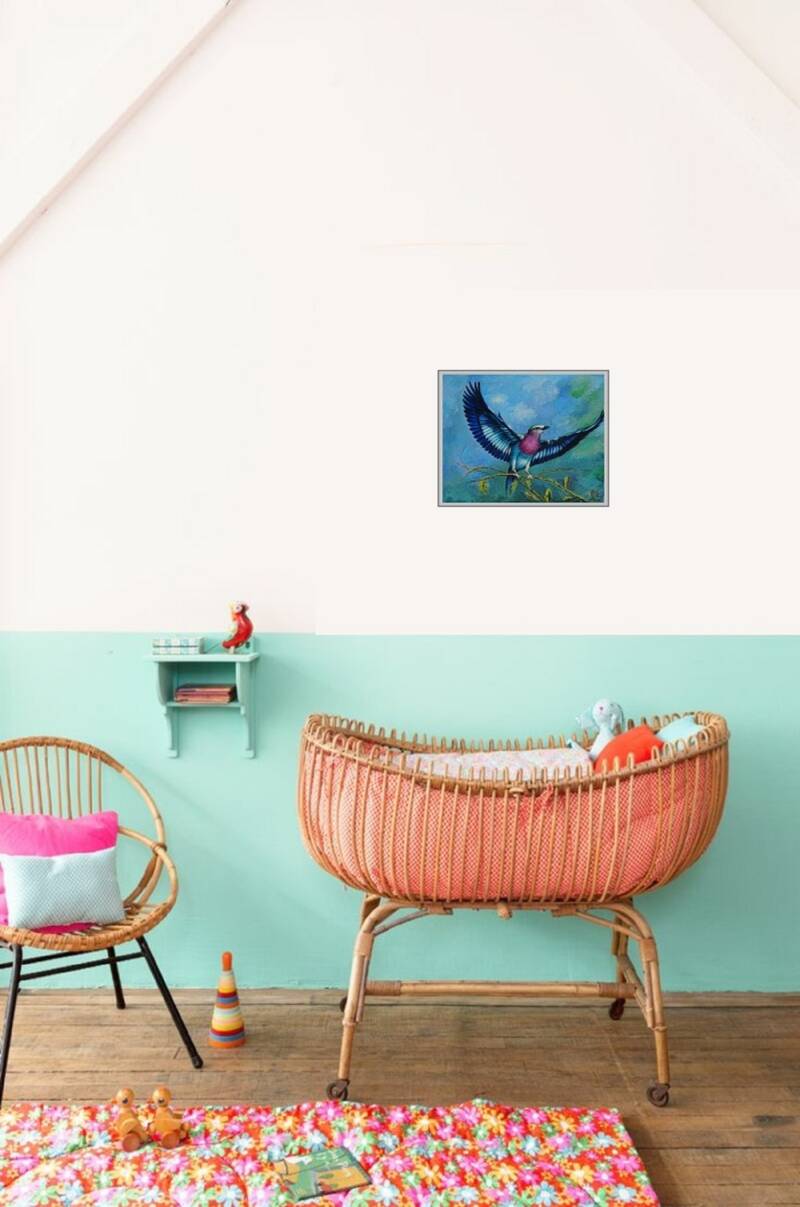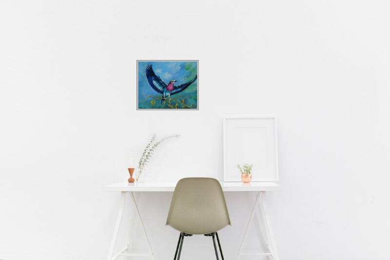 Een blauw gevederde vogel wordt over het algemeen gezien als een vogel waar mensen blij van worden. Deze prachtige vogel brengt geluk als je hem/haar ziet. Veel mensen hebben een sterk geloof in deze mythe. Reden genoeg om deze prachtige vogel in een landschap te schilderen. Ik maak graag mensen blij. De techniek die ik gebruikte is impasto.