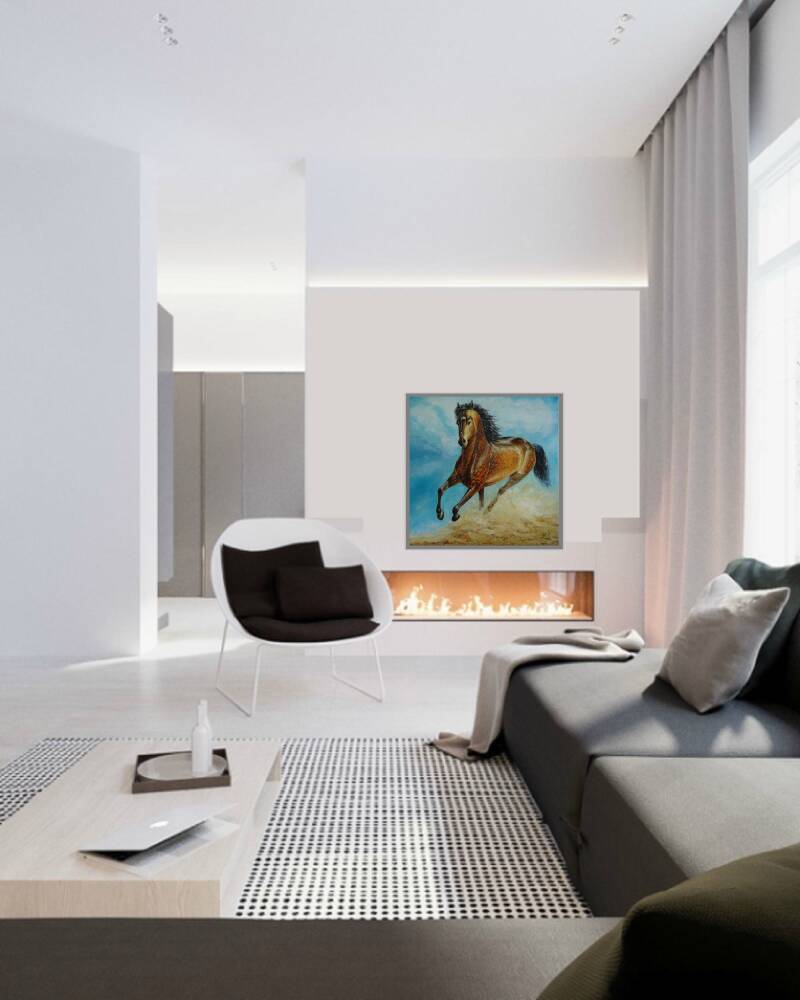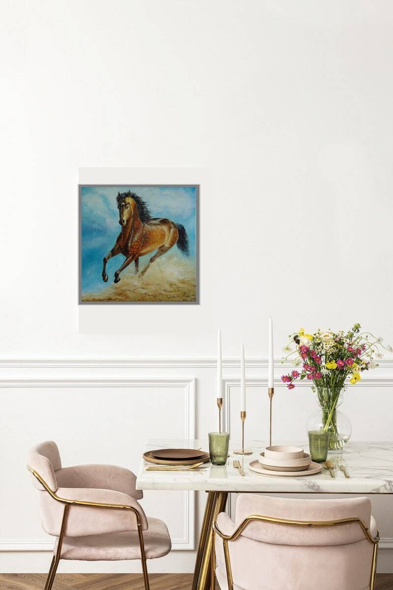 Soms word je geïnspireerd door een scène uit een film. In dit geval zag ik een western met mustangs. Prachtige paarden met een krachtige, vurige uitstraling. Dat wilde ik vastleggen in dit schilderij. Geweldig om deze prachtige mustang in volle galop te zien. Ik kan er elke keer met bewondering naar kijken.