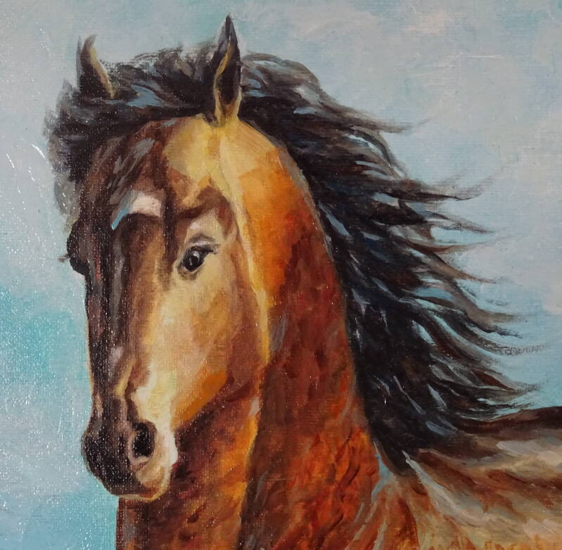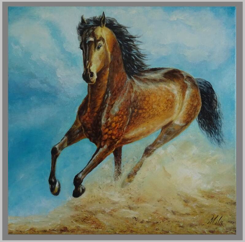 Sometimes you are inspired by a scene from a movie. In this case, I saw a western that featured mustangs. Beautiful horses with a powerful, fiery appearance. I wanted to capture that in this painting. Great to see this beautiful mustang at full gallop. I can look at it with admiration every time.