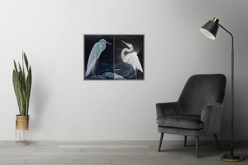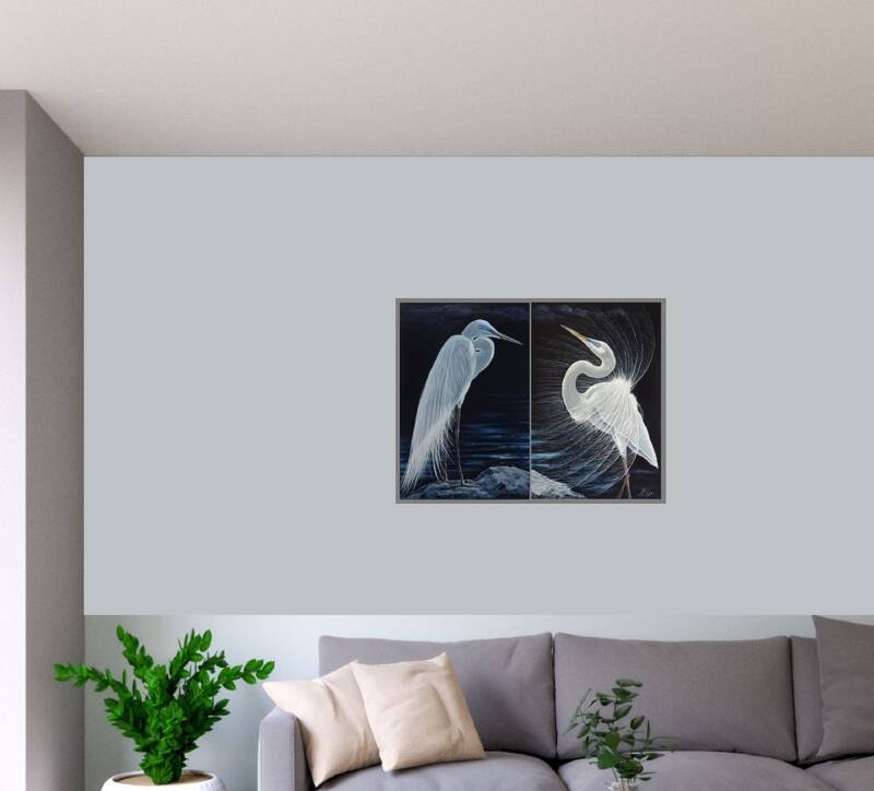 A diptych of 2 white herons on the edge of a lake - Size 2x 40 x 60 cm / 15,6 x 23,5 inches