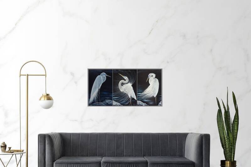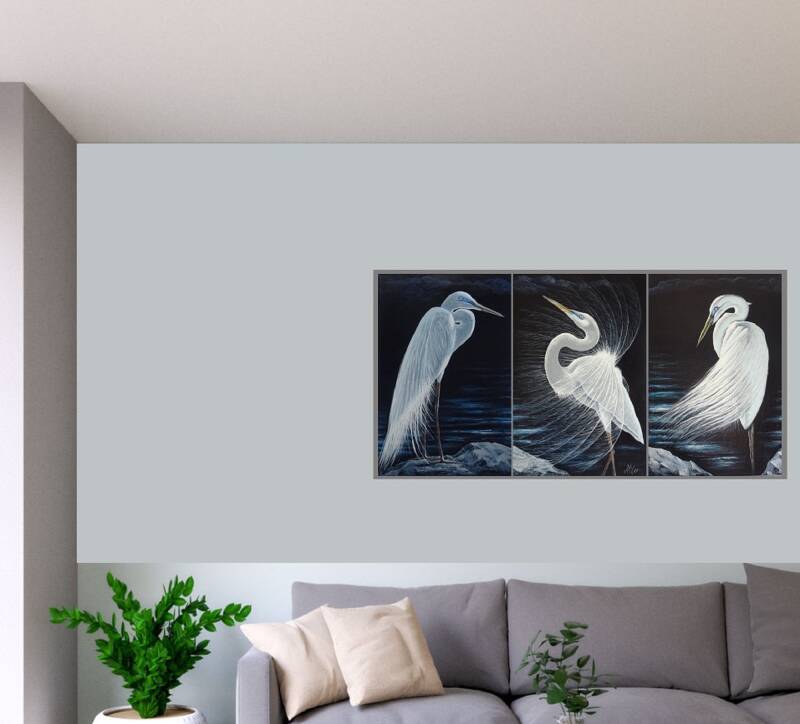 A triptych of 3 white herons on the edge of a lake - Size 3x 40 x 60 cm / 15,6 x 23,5 inches