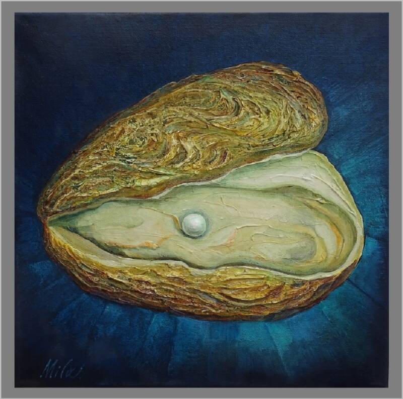 Glück findet man oft in kleinen Dingen oder kleinen Ereignissen. Ein süßer Kuss von deiner Enkelin, wenn du es am wenigsten erwartest oder eine Rose von deinem Mann, die er dir beim Blumenhändler im Restaurant abkauft. Diese süßen kleinen Ereignisse, die mich wirklich glücklich machen können. Die Perlenauster ist ein Symbol zu einem solchen Ereignis oder Glück. Völlig unerwartet findet man beim Öffnen der Auster eine Perle. Für mich ein guter Grund, ein Gemälde daraus zu machen. Der Farbton ist fantastisch. Von gebrochenem Weiß bis Beige in einem marineblauen Rahmen. Dieses Gemälde ist ein Schmuckstück für fast jedes Interieur. Die verwendete Technik ist impasto.