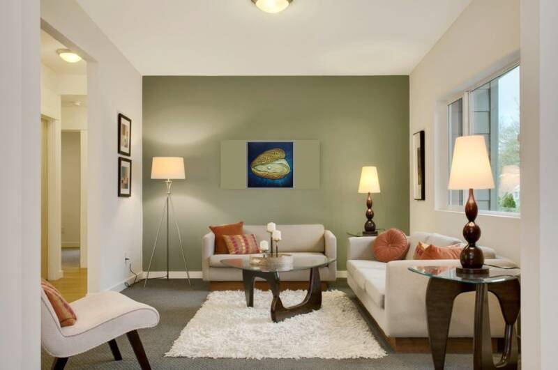 Happiness is often found in small things or small events. A sweet kiss from your granddaughter when you least expect it or a rose from your husband that he buys for you from that flower peddler in the restaurant. Those sweet little events, that can really make me happy. The pearl oyster is a symbol of such an event or luck. Completely unexpectedly you can find a pearl when you open the oyster. For me a good reason to make a painting of it. The hue is fantastic. From off-white to beige in a navy blue setting. This painting is a gem for almost any interior. The technique used is impasto.