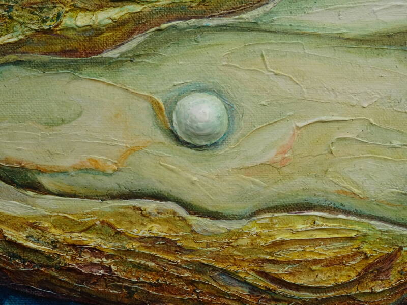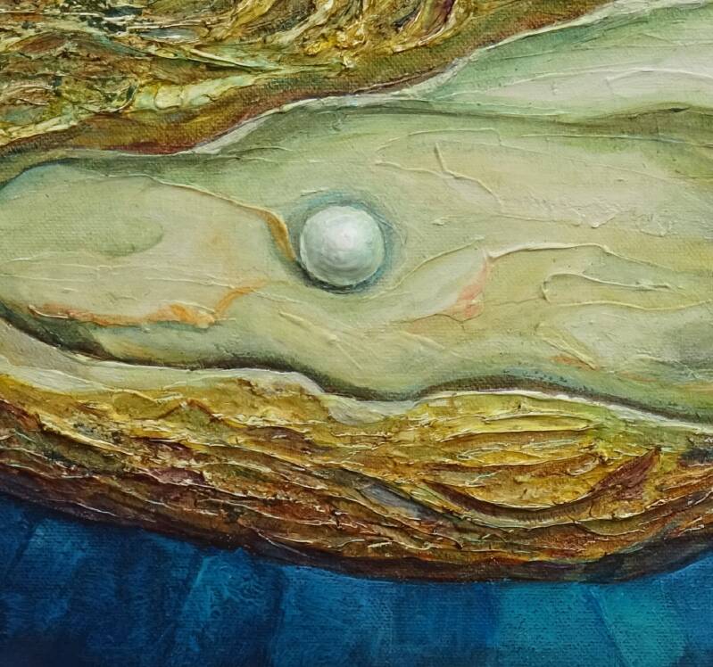 Het geluk zit vaak in kleine dingen of kleine gebeurtenissen. Een lief kusje van je kleindochter als je het even niet verwacht of een roos van je echtgenoot die hij voor je koopt bij die bloemenventer in het restaurant. Die lieve kleine gebeurtenissen, daar kan ik nou echt gelukkig van worden. De pareloester is een symbool van zo´n gebeurtenis of gelukje. Geheel onverwacht kan je een parel vinden als je de oester opent. Voor mij een goede reden om daarvan een schilderij te maken. De kleurschakering is fantastisch. Van gebroken wit naar beige in marine blauwe setting. Dit schilderij is een pareltje voor vrijwel elk interieur. De gebruikte techniek is impasto.