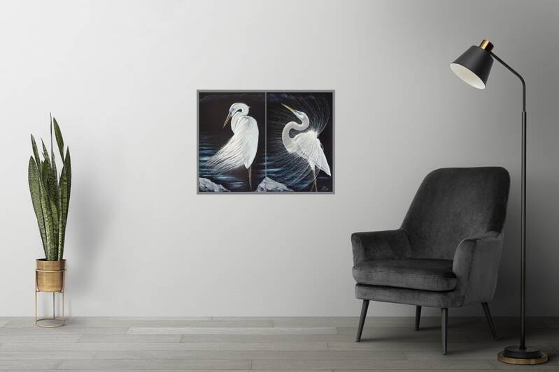 Ik heb deze reigers geschilderd omdat ze een prachtig kunstwerk zijn in bijna elk type interieur als tweeluik of zelfs als drieluik. De techniek die ik gebruikte is impasto.